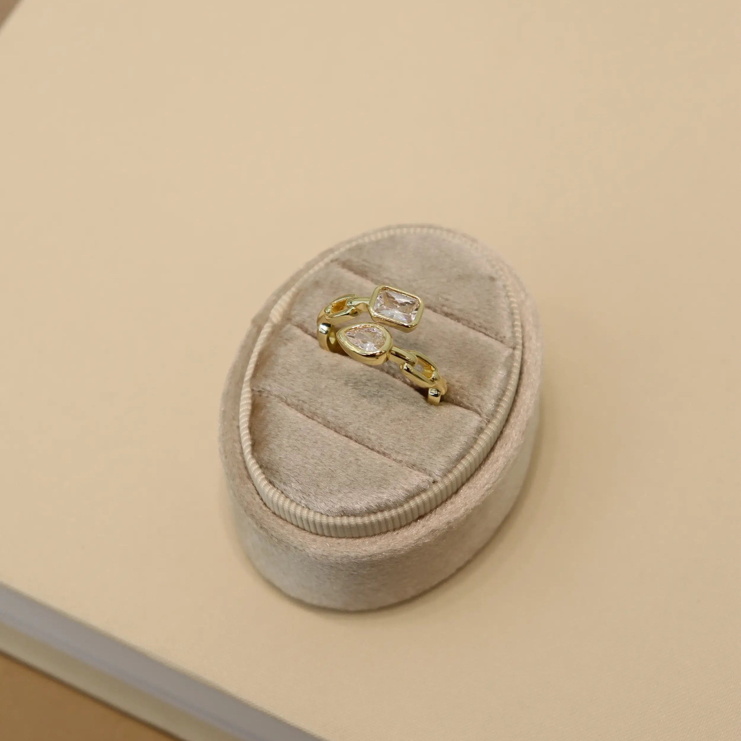 The Tessa Toi et Moi Link Ring — two stones, one statement. A pear-cut and an emerald-cut sit side by side on our signature link band for the perfect mix of soft and sharp.