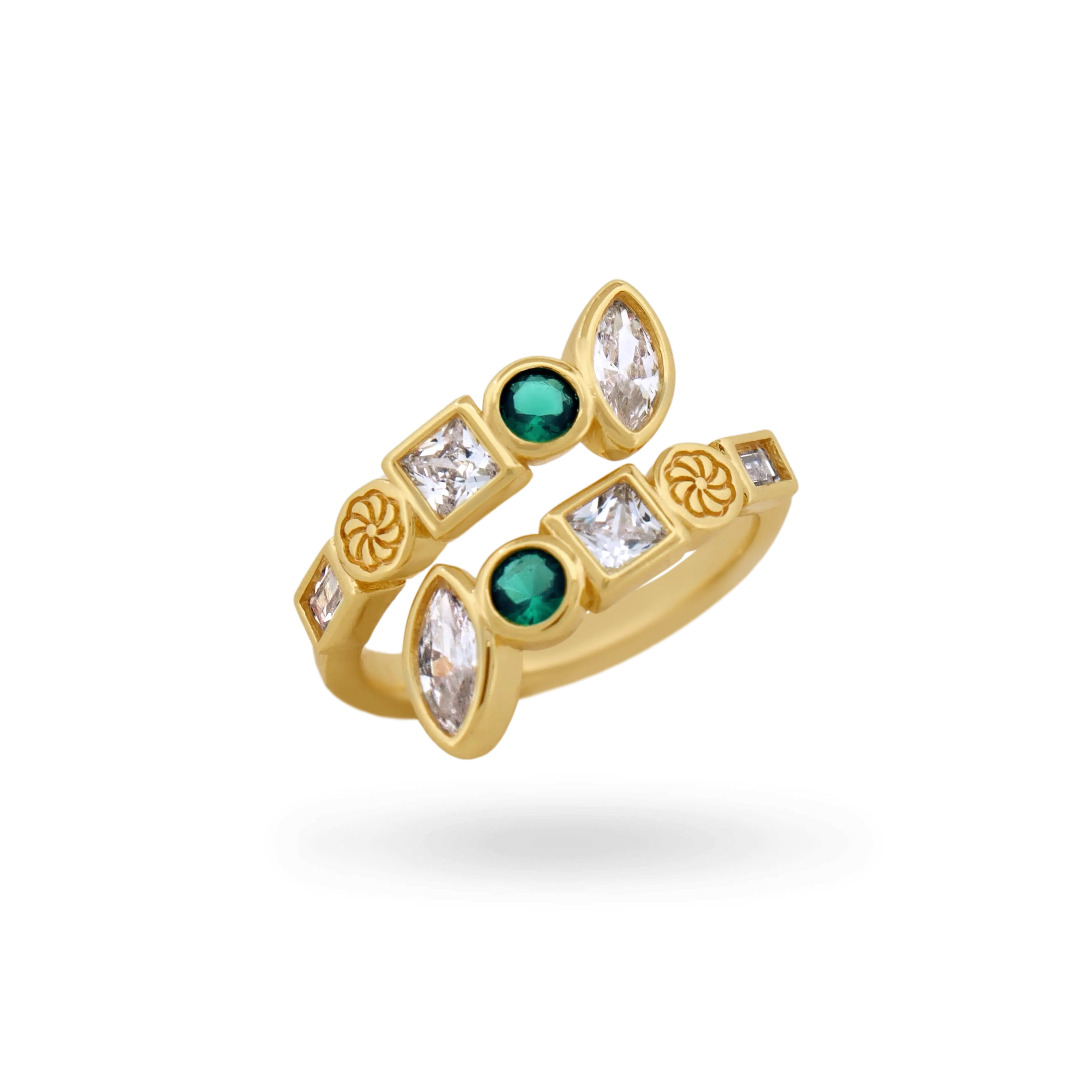 Bold and symbolic, the Sienna Wrap Ring brings together emerald and white IceLink Signature-Bright CZ stones with IceLink’s iconic eternity spiral for a striking, layered look. Crafted in 14K gold plated brass with the look of real gold, this wrap-style statement ring blends elegance, meaning, and modern edge within the La Vie en Emerald collection.