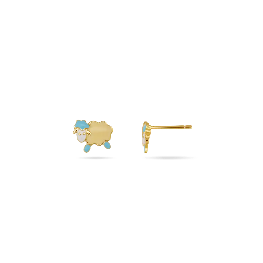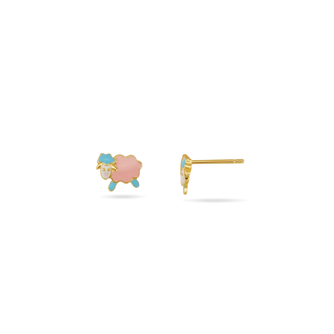 Available in baby pink with blue accents or yellow with blue accents, these tiny sheep studs bring a soft, whimsical touch to her everyday style.